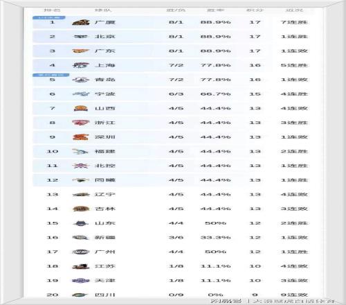 ①、廣廈、北京、廣東三強(qiáng)鼎立,8勝1負(fù)位居前三甲;