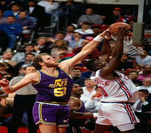 “猛犸象”馬克-伊頓是1982年第四輪第三順位,他身高2.24米,是一名防守型球員。伊頓在NBA打了11個(gè)賽季全部效力于爵士,除了最后一個(gè)賽季出戰(zhàn)64場外,他出戰(zhàn)最少的一個(gè)賽季也有79場,其中五個(gè)賽季打滿82場常規(guī)賽,對(duì)于一個(gè)224cm的巨人來說這是非常難得的。伊頓曾兩次榮膺最佳防守球員,三次入選一防,他還入選過一次全明星,斬獲了四個(gè)蓋帽王。生涯出戰(zhàn)常規(guī)賽875場,場均6分7.9籃板,投籃命中率為45.8%,共送出3064次蓋帽,排在歷史第四位,他也是賈巴爾之后第一個(gè)蓋帽總數(shù)超過3000的球員,他生涯場均蓋帽3.5次,位列歷史第二。