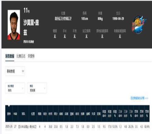 加盟四川男籃之后,龐茲帶隊(duì)打了4場(chǎng),在場(chǎng)均36.8分鐘時(shí)間里,能貢獻(xiàn)23.8分2.3籃板7.3助攻1.8搶斷,投籃命中率53.5%,三分球命中率26.3%,罰球命中率82.4%。