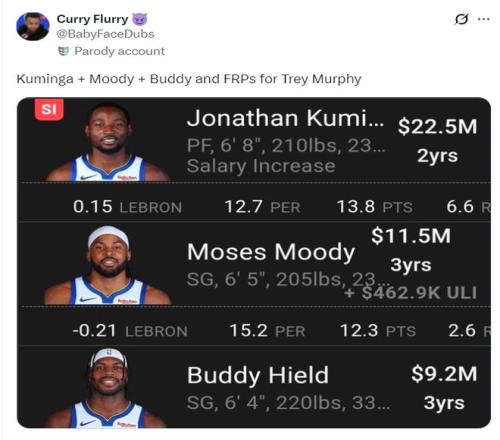 勇士媒體還在憧憬用穆迪+希爾德+庫明加+1個首輪簽去換墨菲,他們的如意算盤就這樣落空了,說實話這三人對于鵜鶘陣容來說的確沒有什么大用,而且薪資也不匹配,墨菲今年只有2500萬的年薪。