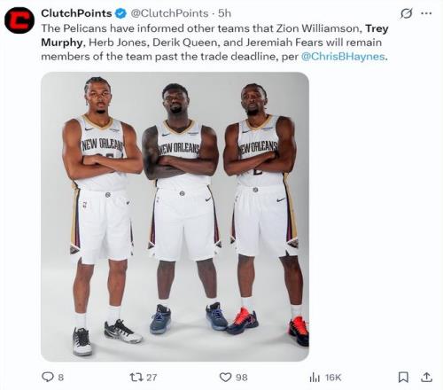 賽前傳來了一個消息,根據(jù)《雅虎體育》記者克里斯-海恩斯的消息,鵜鶘隊已經(jīng)告知聯(lián)盟各隊,在交易截止日前:錫安、墨菲、奎因、費爾斯、赫伯特-瓊斯五人都會留在鵜鶘陣容中,這5人之外的球員才能被交易。