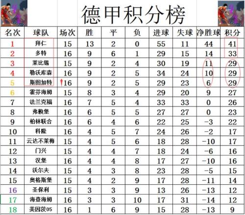 積分榜方面,拜仁13勝2平繼續(xù)保持不敗,少賽1場領(lǐng)先多特8分高居榜首。勒沃庫森慘敗后,凈勝球少了萊比錫1個(gè)“自動(dòng)”跌出前3,萊比錫躺進(jìn)前3,斯圖加特大勝后追了上來,凈勝球劣勢排在第5。