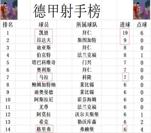 射手榜方面,凱恩19球領(lǐng)跑,昂達(dá)夫今天2傳1射造3球,超過迪亞斯,伯克特1球,9球獨(dú)居第2。馬拉破門追上奧利斯和塔巴科維奇,7球并列第5,格里弗進(jìn)球,追上阿莫拉等人6球剛好擠入前十。