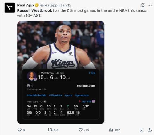 全場(chǎng)比賽威少34分鐘,16中8+三分8中4,拿到22分7助攻5籃板1搶斷5失誤,命中率50%;