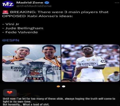 ESPN爆料,據(jù)阿隆索身邊人士透露,阿隆索對部分關(guān)鍵球員在場內(nèi)外的貢獻(xiàn)感到失望,更重要的是,有一小部分“有影響力、直言不諱”的球員,并不愿意接受他的戰(zhàn)術(shù)理念。隨后,這位人士直接點(diǎn)出了三個人的名字:維尼修斯、貝林厄姆和巴爾韋德。他們可是皇馬當(dāng)前陣容中,話語權(quán)最重的三類代表:鋒線王牌、中場新核和更衣室領(lǐng)袖型人物。